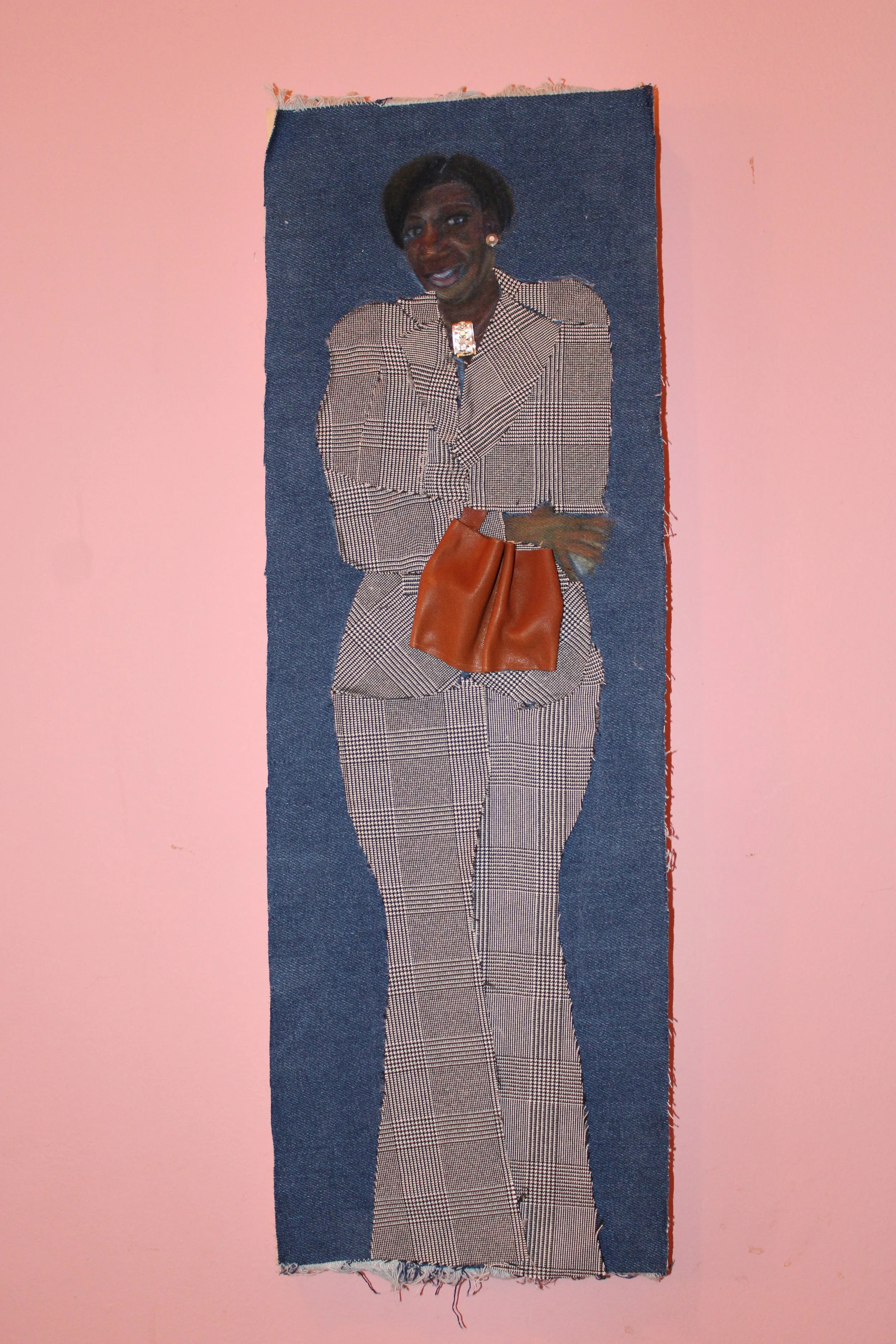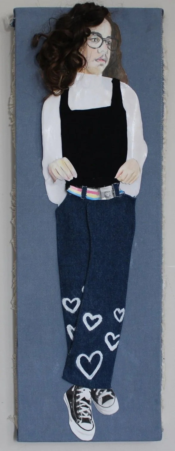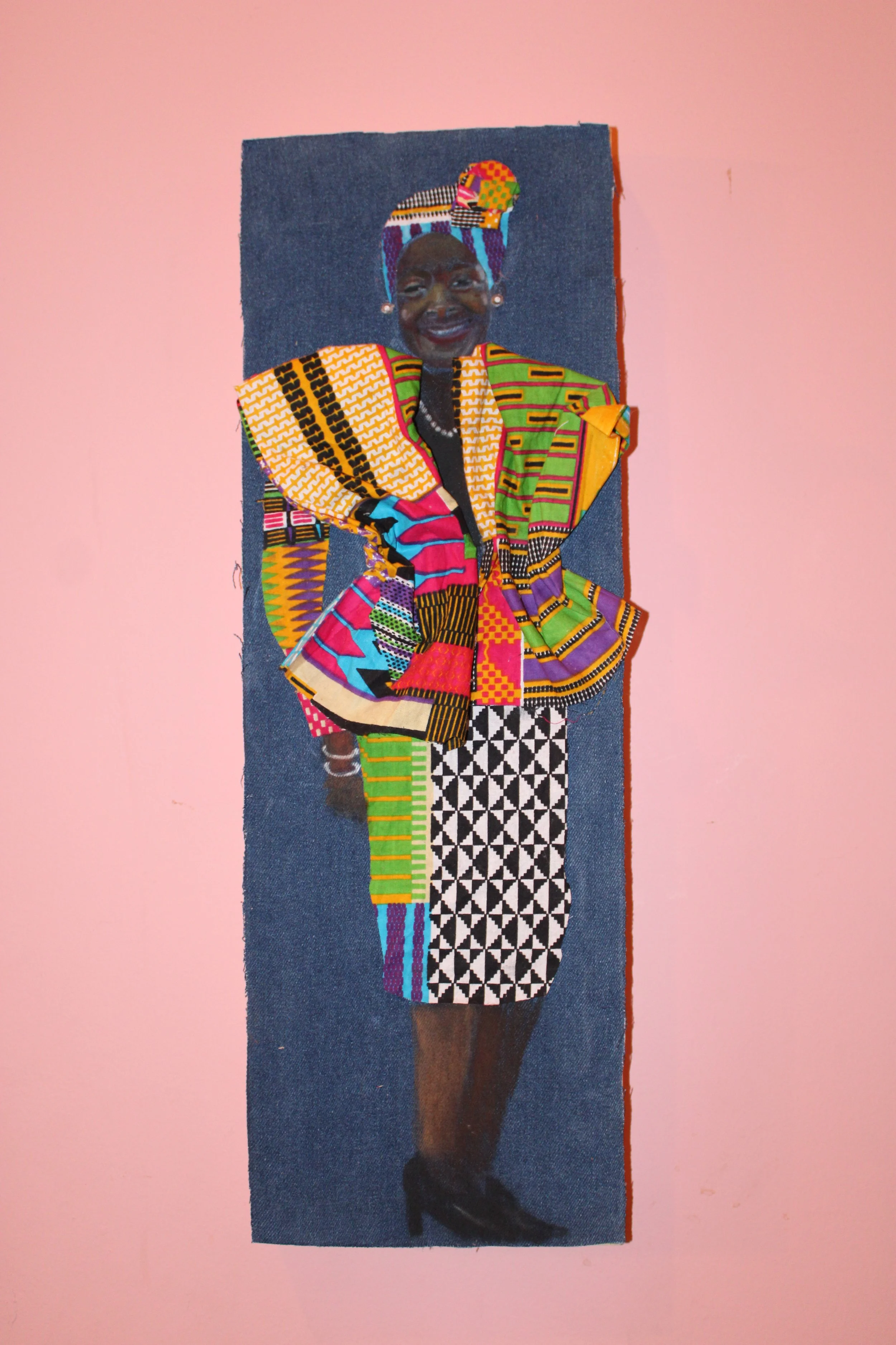 Colored pencil, acrylic, paper, cotton fabrics, and denim. Mounted onto a wood panel.